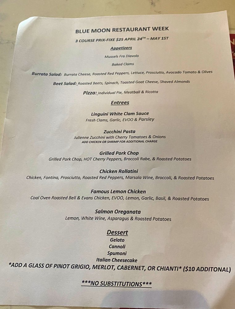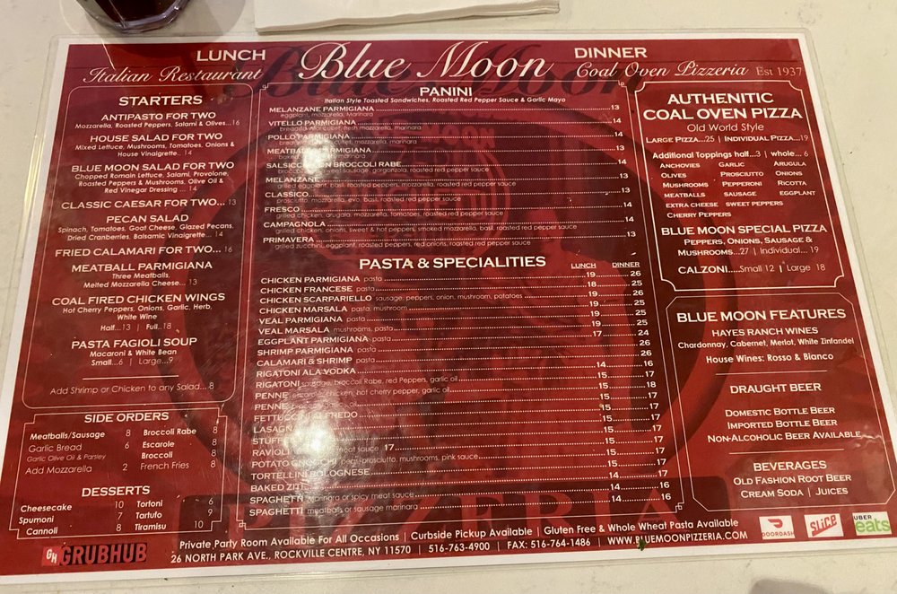 Introducing Blue Moon, a cozy Italian pizza restaurant located in Rockville Centre, NY. The menu offers a variety of coal-fired pizza pies and delicious salads, all made in their signature coal fire oven. Customers rave about the exceptional service, with servers like Jen going above and beyond to ensure a memorable dining experience. The ambiance is described as charming and reminiscent of the 1970s, adding to the overall dining experience.
