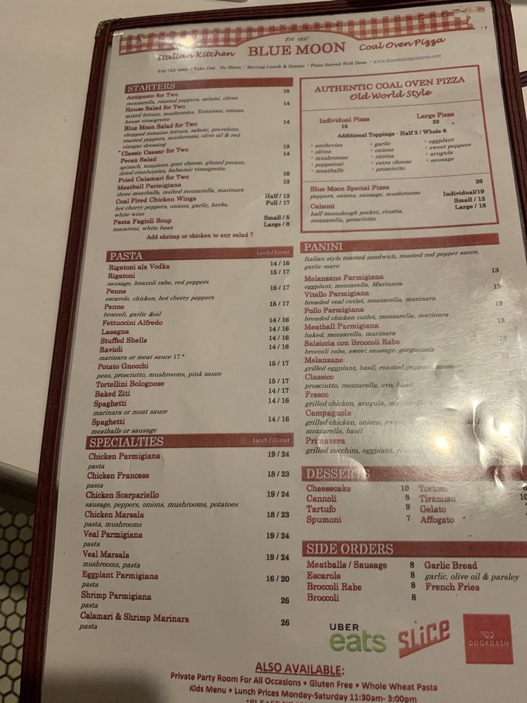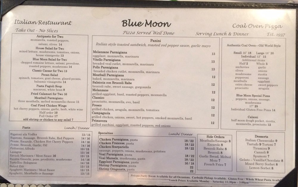 With options for takeout, delivery, and catering, Blue Moon is a versatile choice for lunch, dinner, or group gatherings. The menu features limited vegetarian options, a full bar, and free Wi-Fi, catering to a range of preferences. Whether you're looking for a casual meal with friends or a family celebration, Blue Moon's inviting atmosphere and flavorful dishes are sure to impress. Don't forget to try their specialty coal-fired pizza pies and decadent desserts for a complete dining experience.